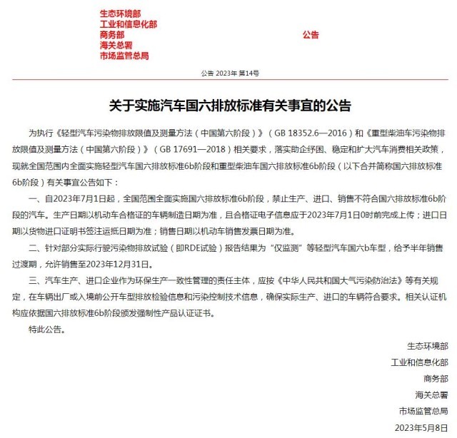 自2023年7月1日起,全国范围全面实施国六排放标准6b阶段,禁止生产、进口、销售不符合国六排放标准6b阶段的汽车。