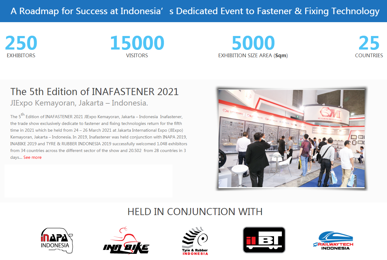 InaFastener展览会每年举办一次,通常在印尼的主要城市之一举行。这个展览会吸引了来自五金制造业、紧固件制造业以及相关领域的参展商,他们有机会展示他们的最新产品、技术和解决方案。