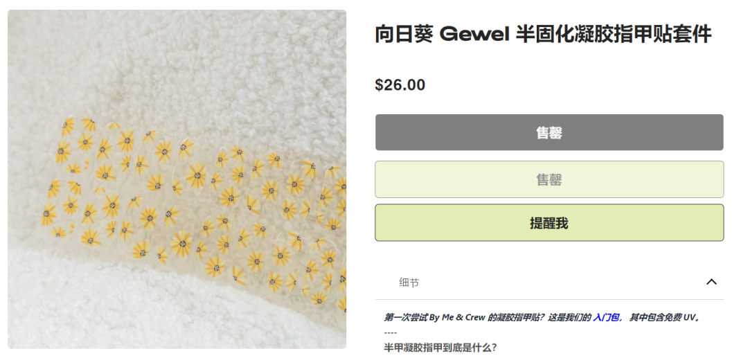 值得一提的是,在热门产品一栏,上述爆款视频带火的“向日葵图形的凝胶指甲贴套件”仍显示“售罄”状态。