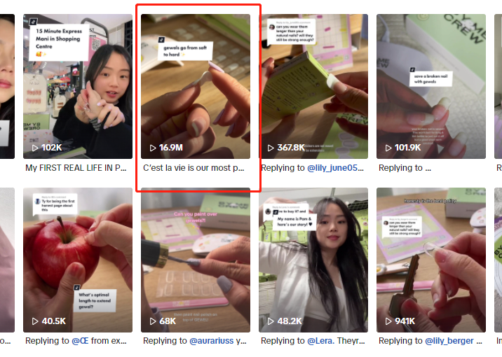 显然,该品牌通过与传统大牌的产品进行创新差异化打法,产品不管是操作性还是便捷性上都对新手友好,才迅速抓住了 TikTok 上极其庞大的居家 DIY 美甲群体的需求点,于平台上走红。
